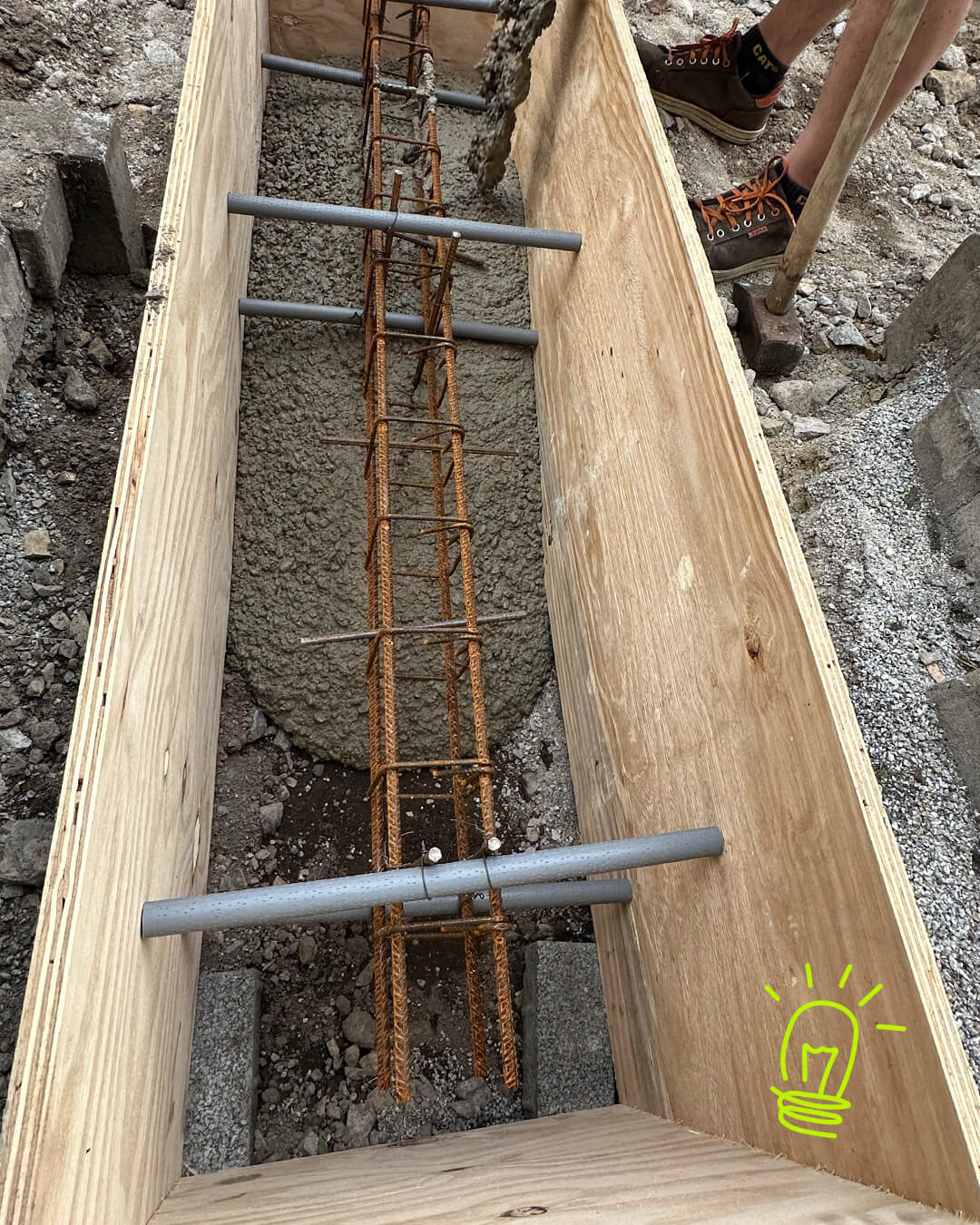 Für Oli und Michael klingelte an einem der letzten Wochenenden früh der Wecker, um die Schalung für die drei Fundamente zusammenzubauen. 🧱🪛 Ein bisschen Holz… ein bisschen Metall… ein paar Schrauben und zack, waren sie in ihrem Element. 💪🔩