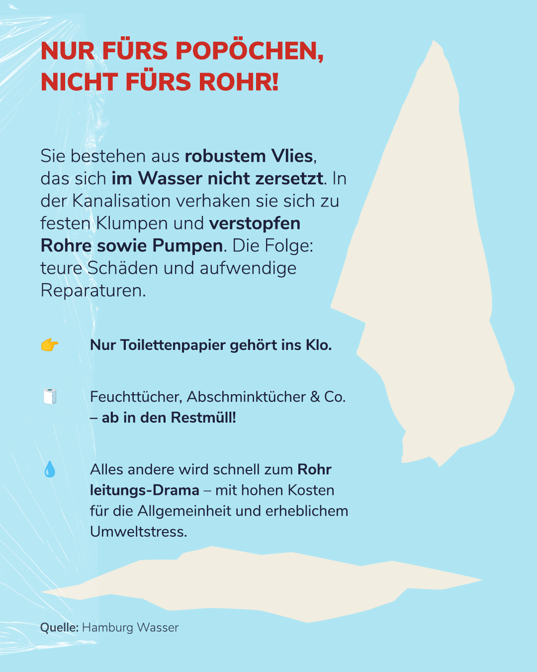 Feuchttücher bestehen aus robustem Vlies, das sich im Wasser nicht zersetzt. In der Kanalisation verklumpen sie, verstopfen Rohre und Pumpen – mit teuren Schäden und großem Aufwand für Reparaturen. 💸🔧