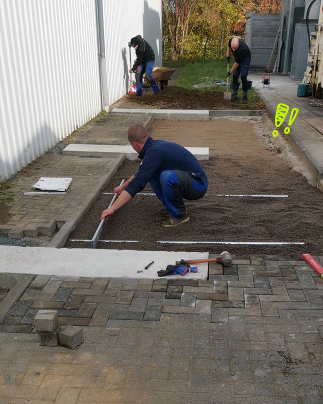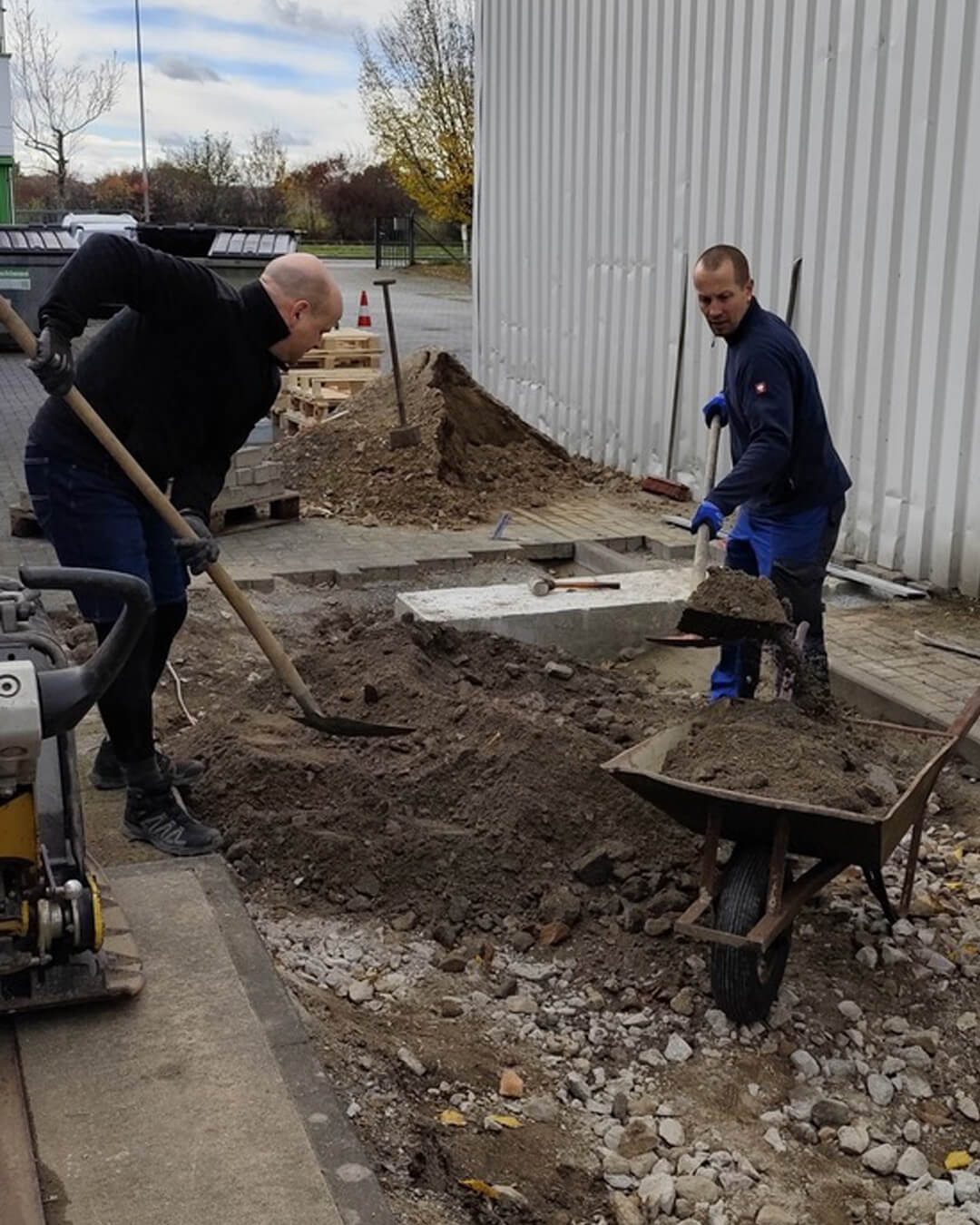 Oli, Thomas, Torsten und Michael haben am Wochenende auf der Baustelle fleißig den Boden weiter aufgefüllt, abgerüttelt und begonnen, das Pflaster neu zu verlegen. 🧱 Wir freuen uns, dass es so gut voran geht! 😊